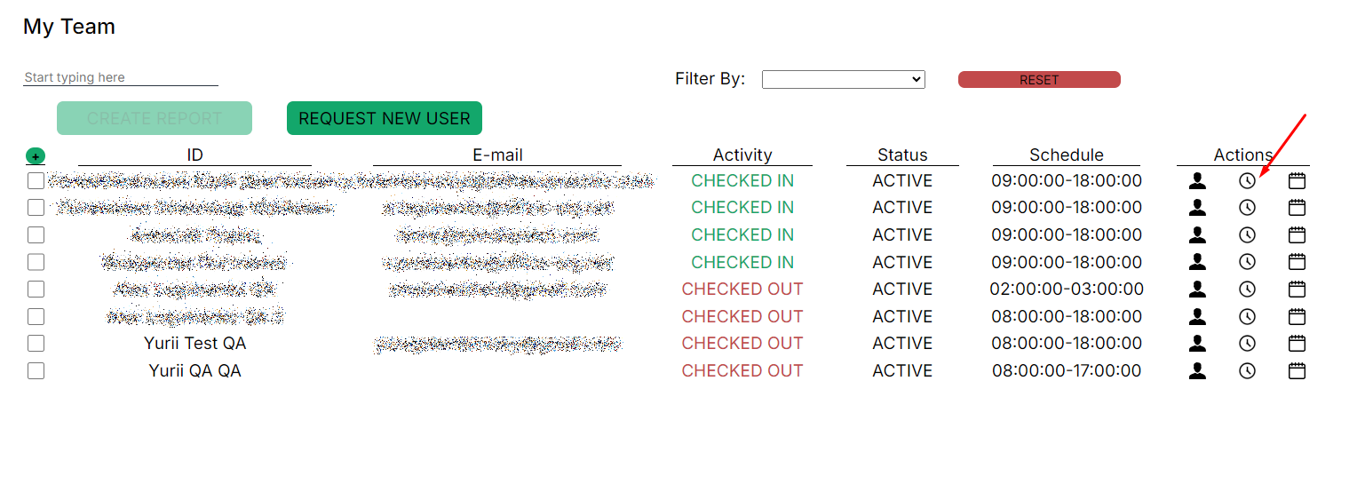 В данном окне доступны данные по выполнению check-in, check-out, pause start и stop по выбранному пользователю. Чтобы закрыть окно, необходимо стрелочку в левом верхнем углу.