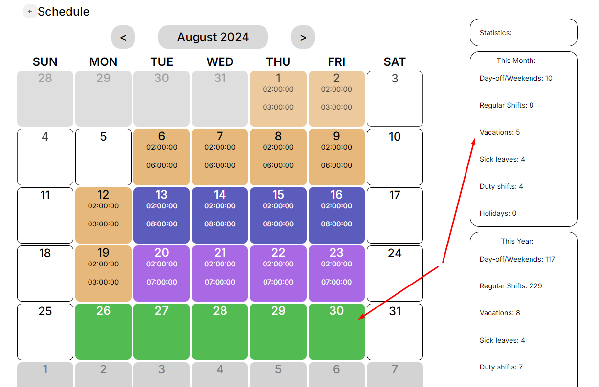 Это окно отображает календарь с отмеченным графиком занятости выбранного пользователя. Цвет заливки каждой ячейки соответствует типу события. Руководитель может редактировать календарь графика занятости выбранного пользователя.