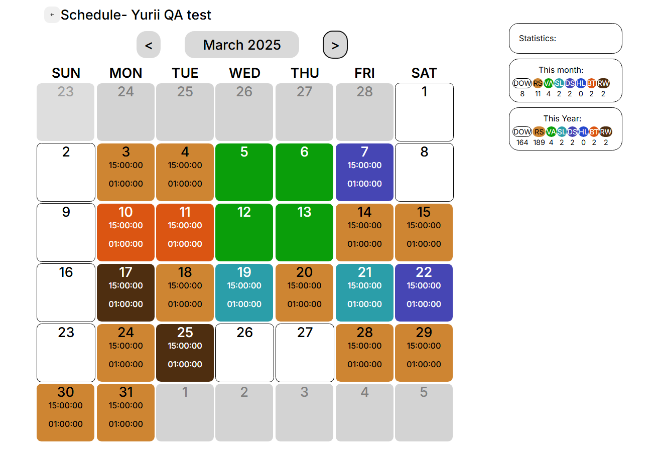 Це меню відображає календар з відміченим графіком зайнятості обраного користувача. Кожна комірка має відповідний колір заливки, що відповідає типу події. Керівник може редагувати календар графіка зайнятості обраного користувача.